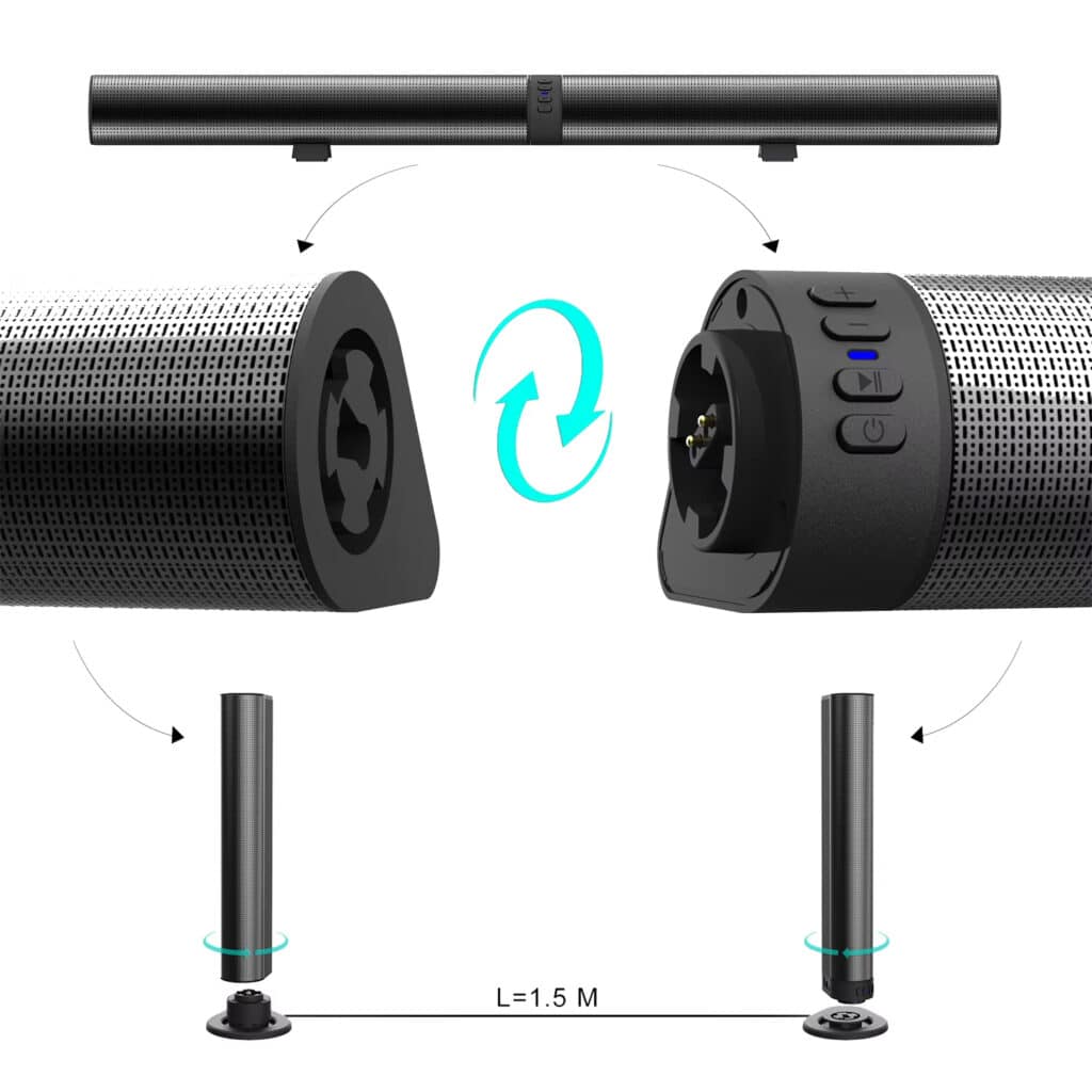 The AuraSozi TV Sound Bar offers a revolutionary 2-in-1 design that transforms from a sleek soundbar to dual tower speakers in seconds. Experience concert-like audio quality with the convenience of built-in 2000mAh battery for true portability.