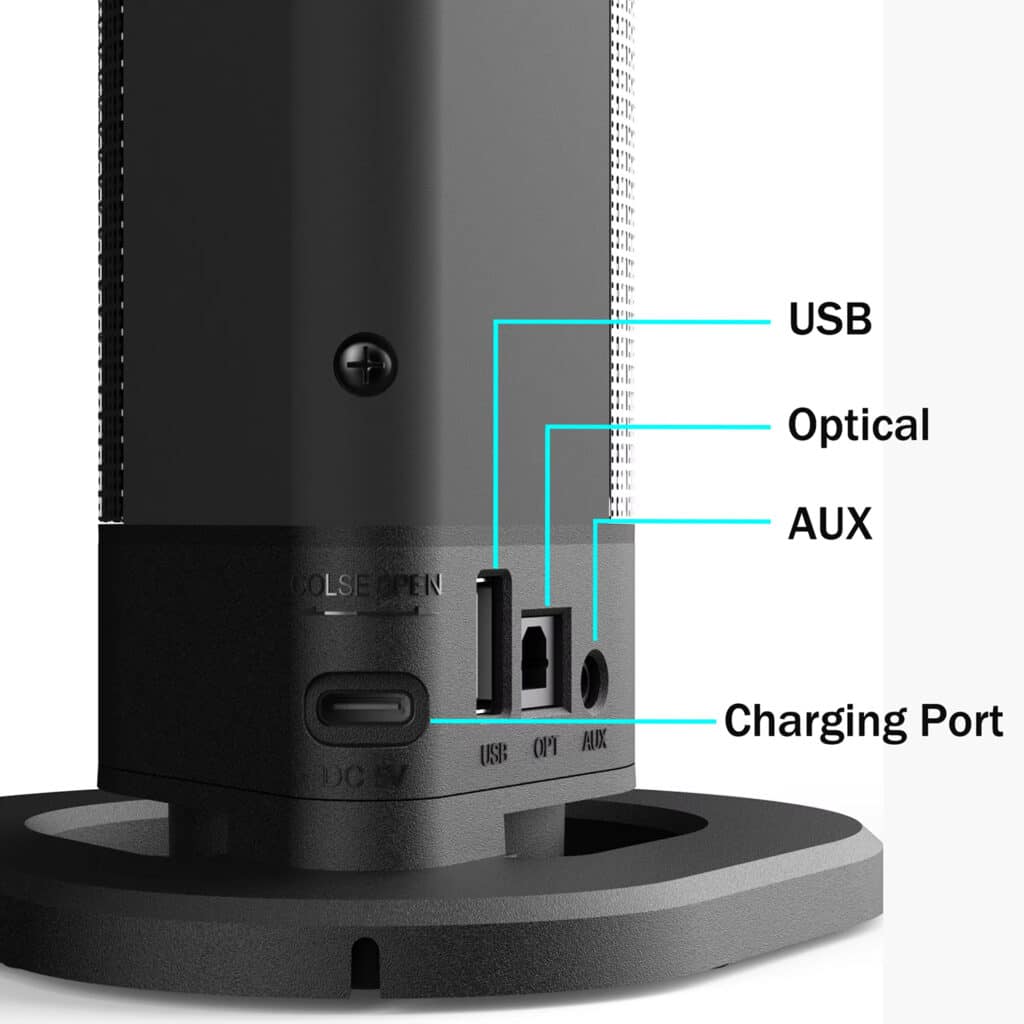 AuraSozi simplifies your entertainment system with multiple connectivity options including Bluetooth 5.3, USB audio input, FM radio, 3.5mm line-in jack, and optical audio input. The intuitive control panel with easy-access buttons for volume, playback, and power makes operation effortless, while the stable silicone anti-slip base ensures secure placement in any configuration.