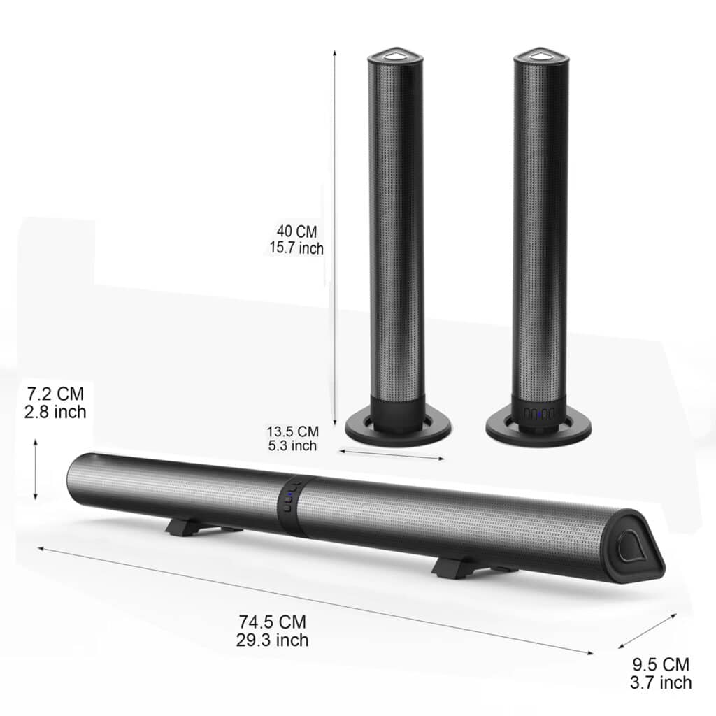 The AuraSozi Sound Bar breaks conventional boundaries with its innovative 2-in-1 design, allowing you to effortlessly switch between a sleek 74.5cm soundbar and dual 40cm tower speakers. This flexibility means you can optimize your audio experience based on room acoustics, space constraints, or simply your mood of the day.