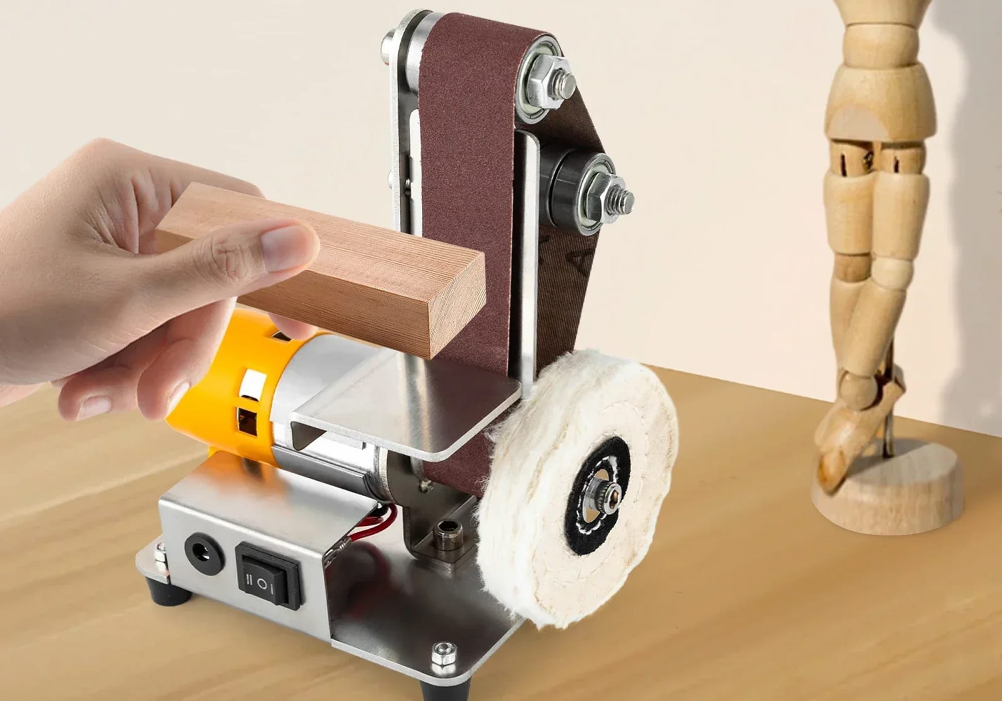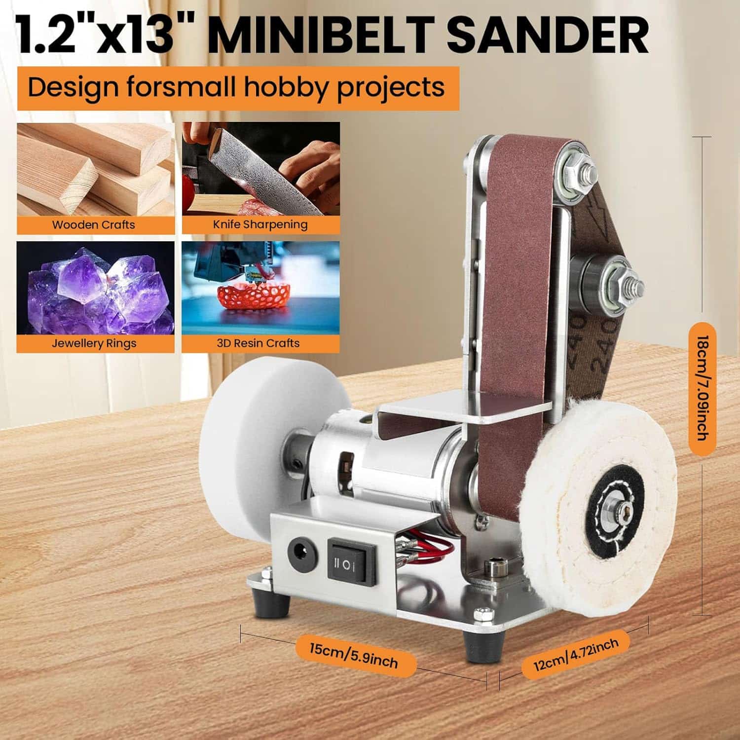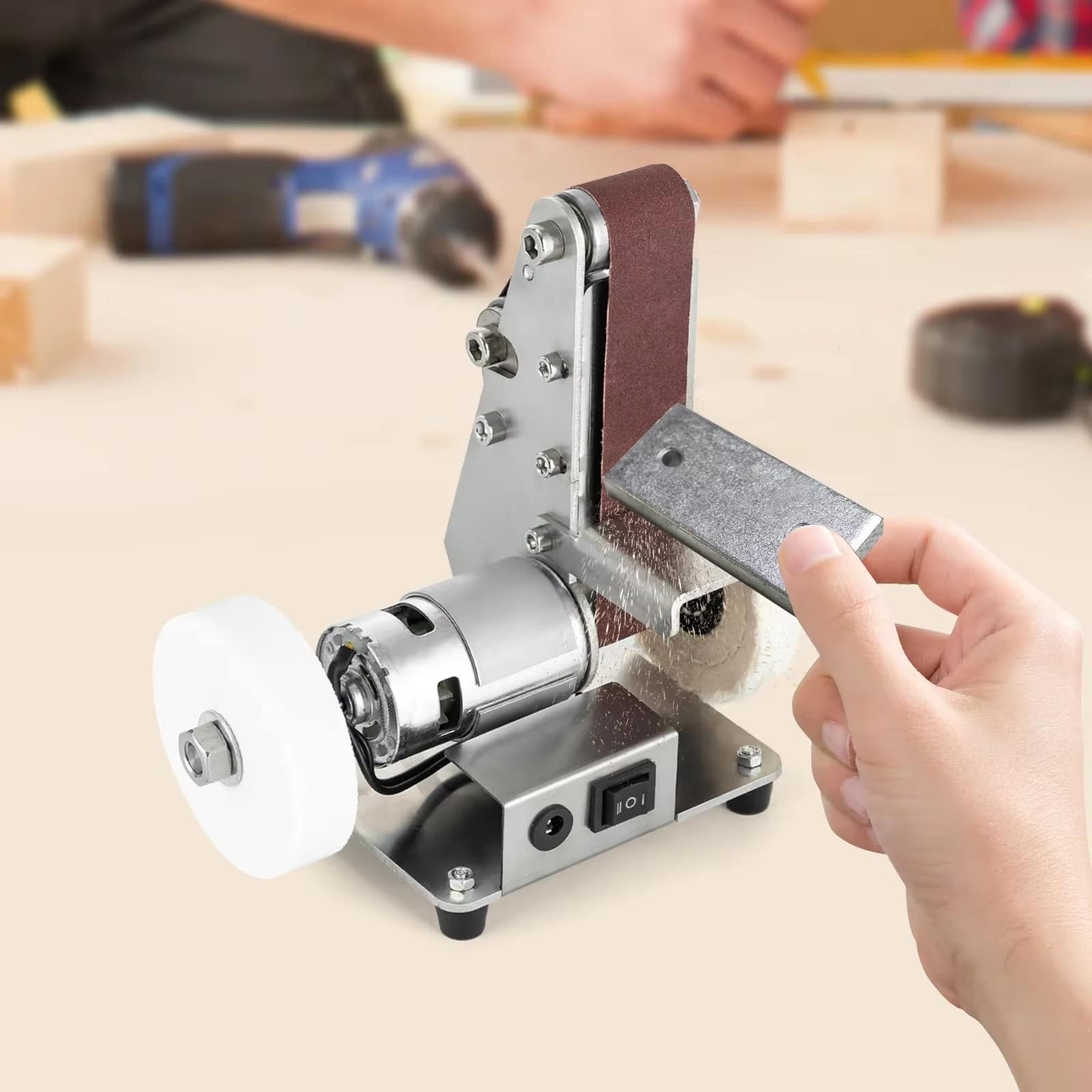 The BeltForgie Belt Sander excels with wood, metal, plastic, and soft materials like jewelry. Its variable speed control adapts to different material hardness, making it suitable for diverse DIY and professional applications.