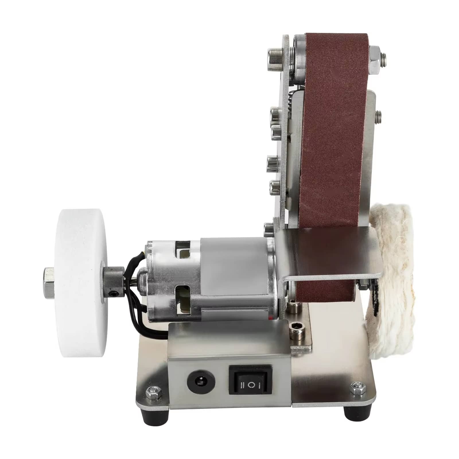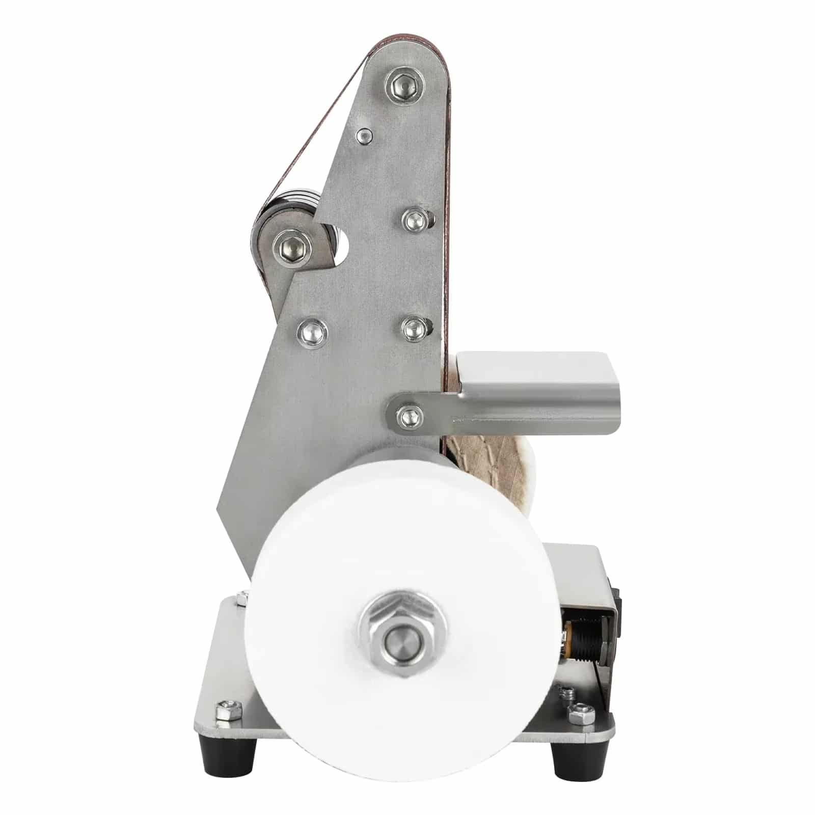 Loosen the tension screws, slide off the old belt, position the new belt centered on the wheels, and retighten. The process takes under a minute, allowing quick transitions between different grit levels.