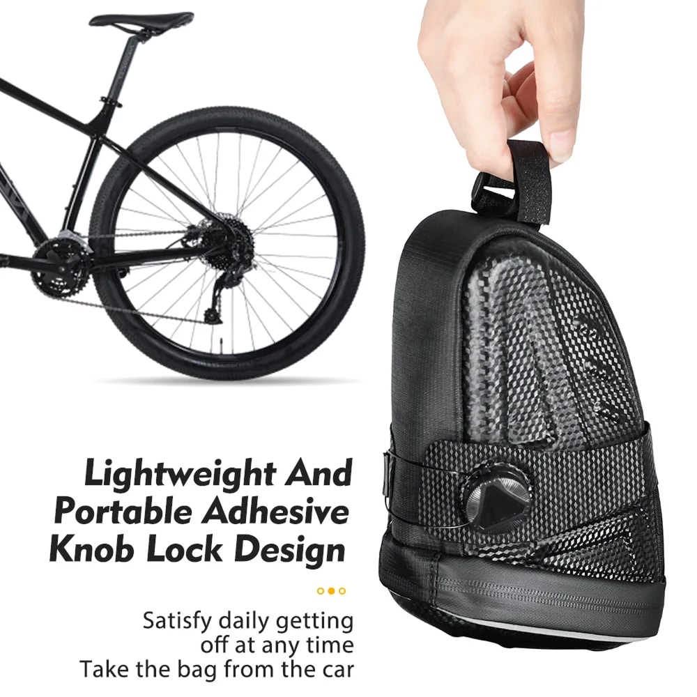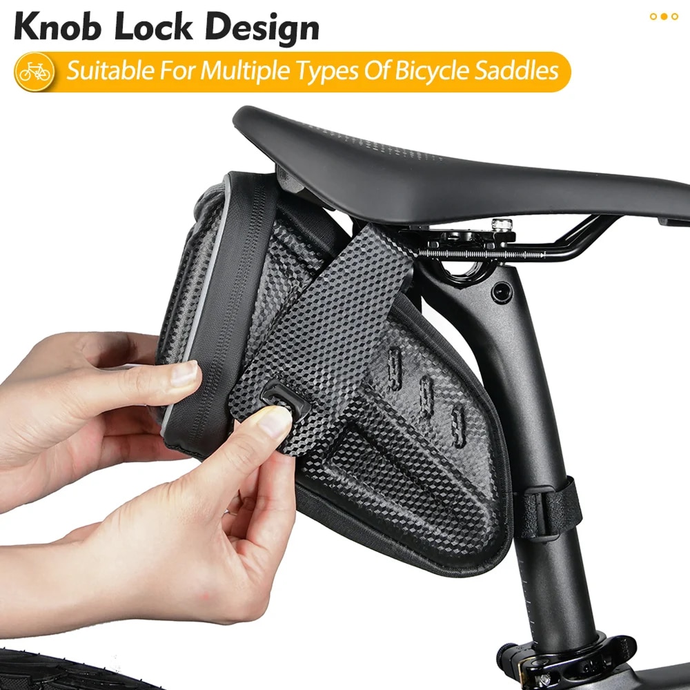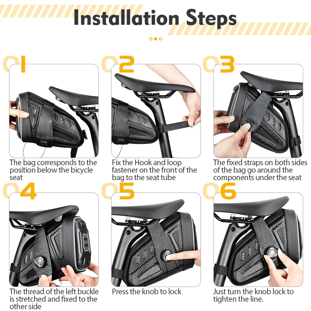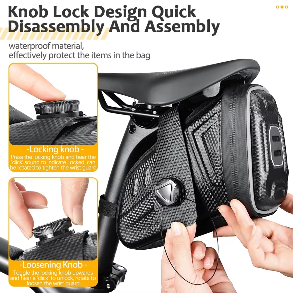 Installation takes under 60 seconds without any tools. Simply position the bag under your saddle, secure the front strap, wrap side straps, and twist the knob lock. The click confirms secure attachment.