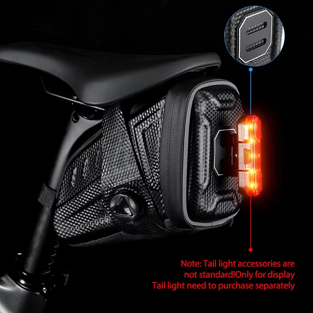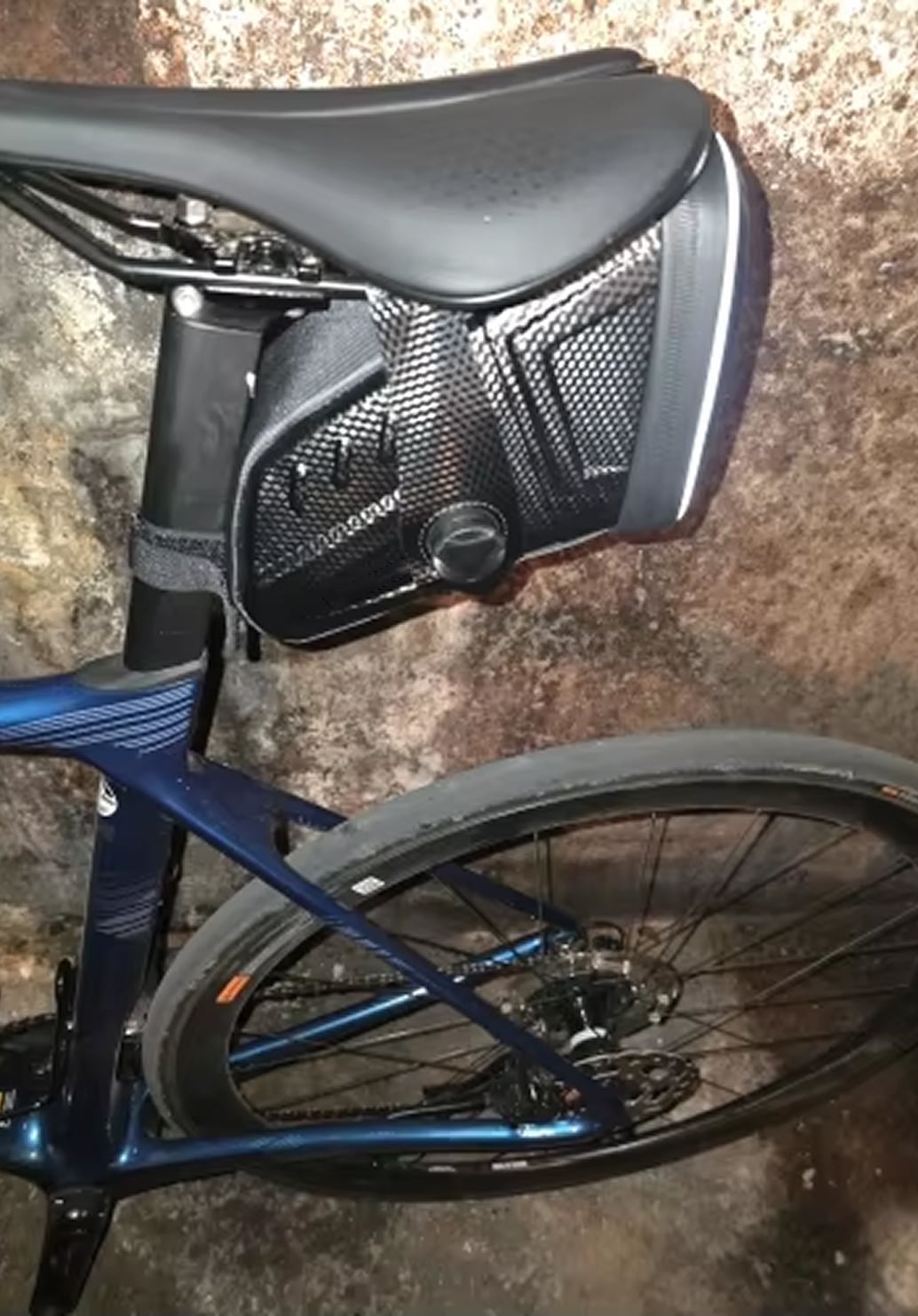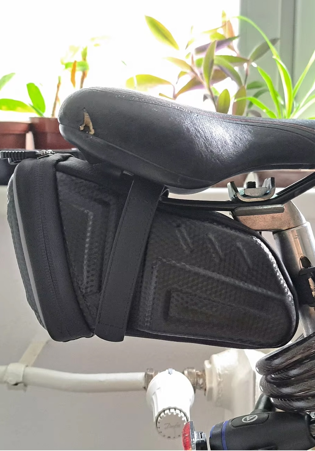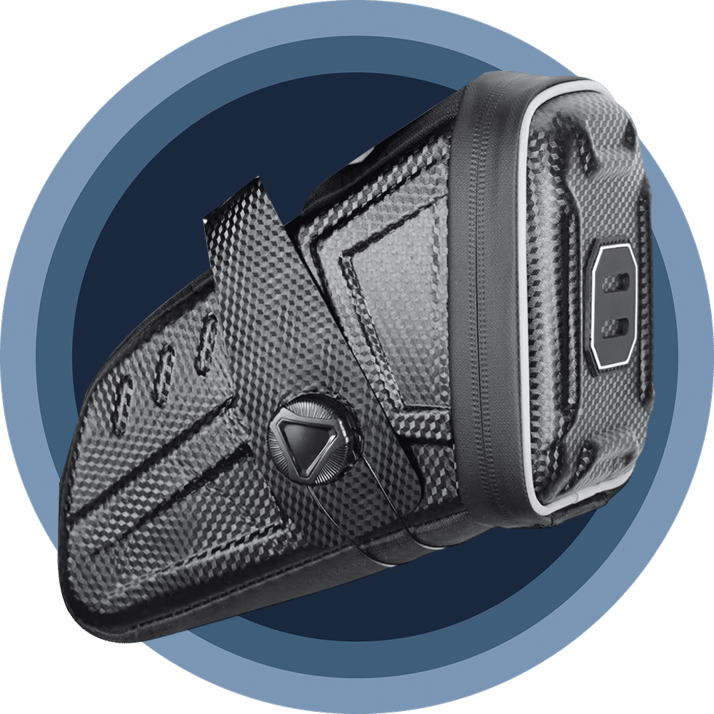 Installation takes under 60 seconds without any tools. Simply position the bag under your saddle, secure the front strap, wrap side straps, and twist the knob lock. The click confirms secure attachment.