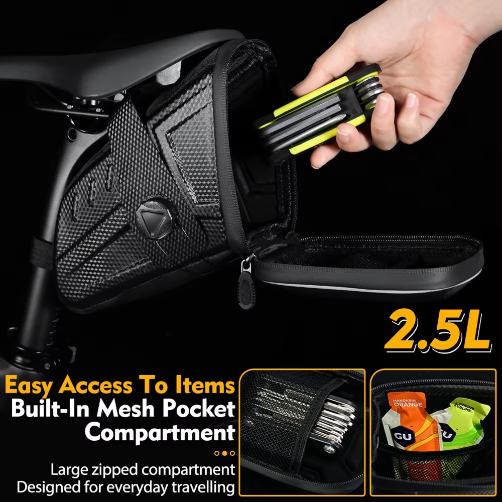 The 2.5L capacity comfortably holds a multi-tool, spare tube, tire levers, patch kit, mini pump, energy bars, keys, and a small wallet. Internal mesh pockets keep smaller items organized and easily accessible.