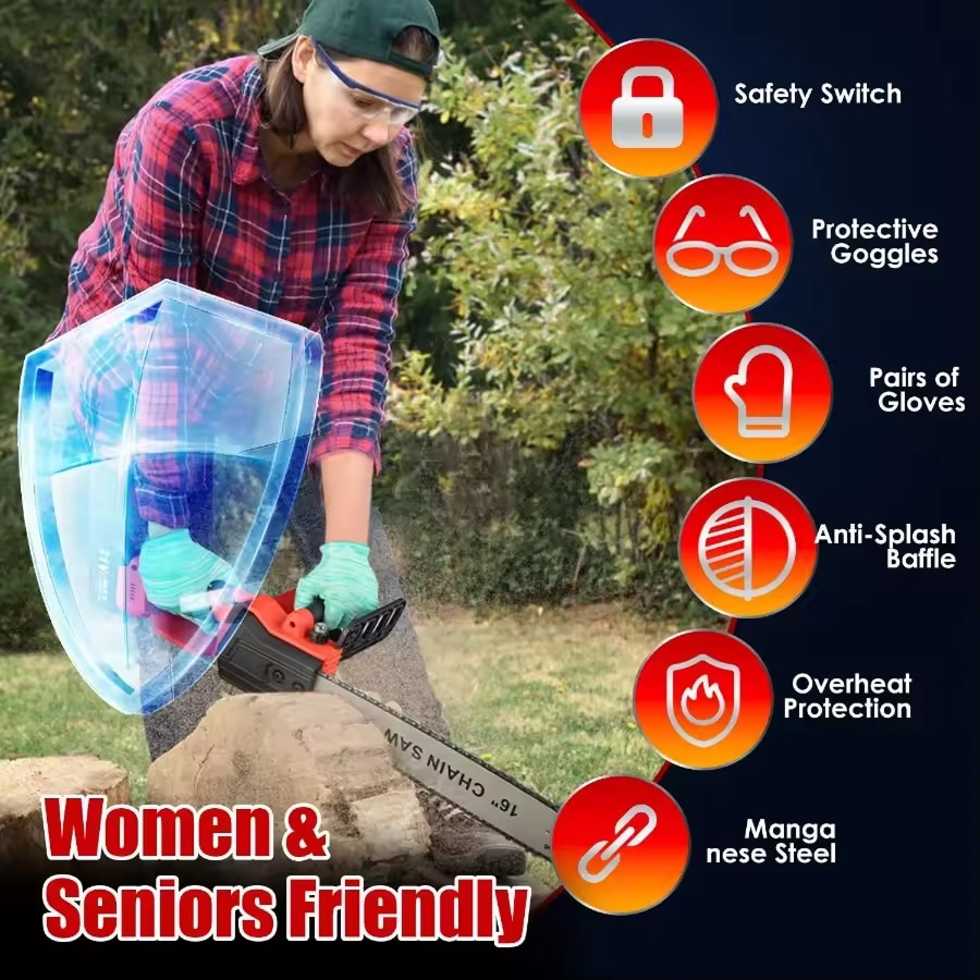 This chainsaw exceeded my expectations for power and runtime. I used it to clear several fallen trees after a storm, and the 850W motor cut through 12-inch oak branches like butter. The safety features give me peace of mind, and the quiet operation means I can work early morning without bothering my neighbors.