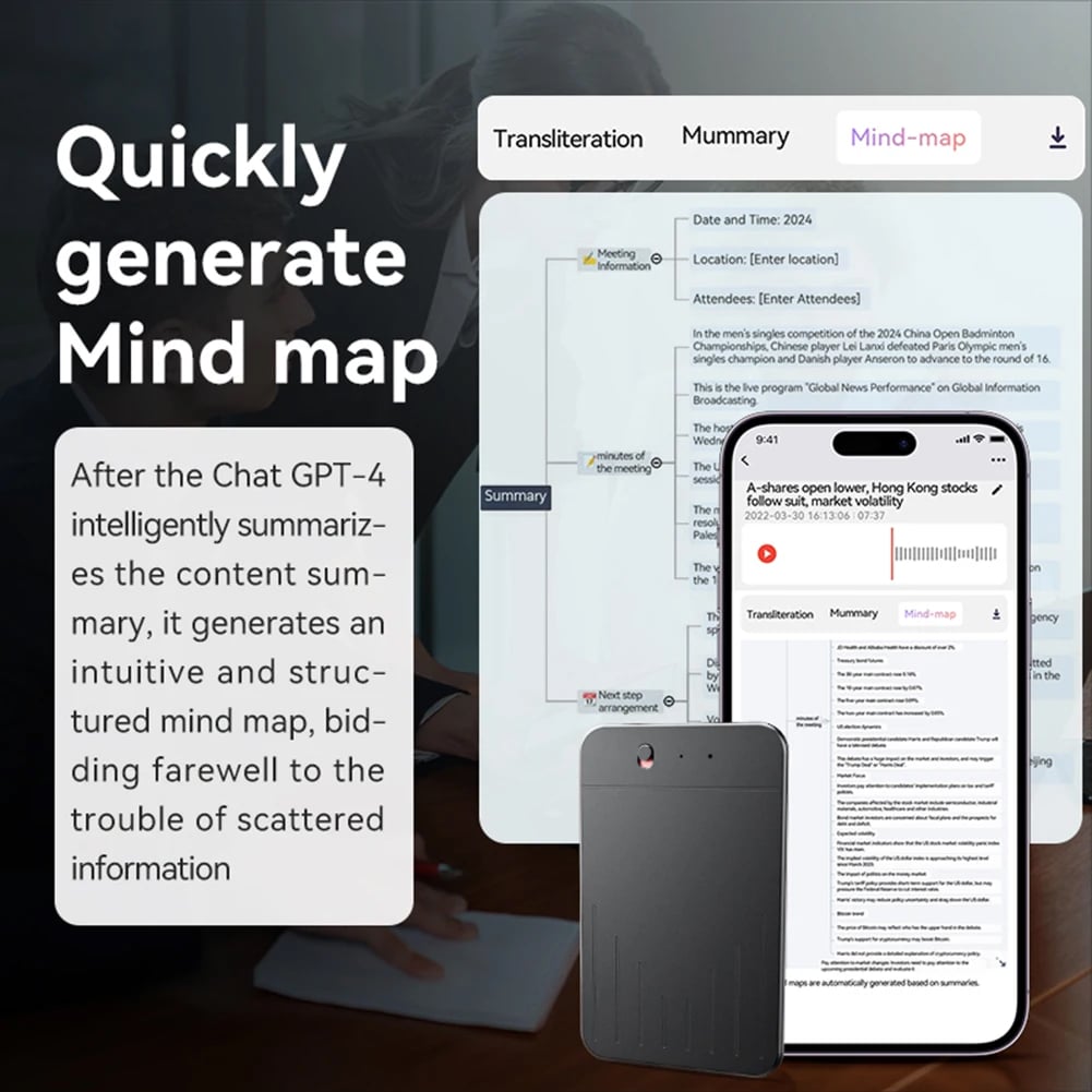 The CaptiVoxo uses advanced AI algorithms to analyze your recordings and automatically generate concise summaries, key points, and organized mind maps from lengthy conversations.