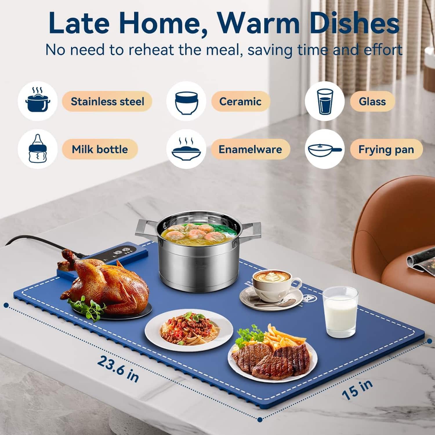 Large 23.6 x 15 inch heating surface provides ample space for multiple dishes and containers simultaneously.