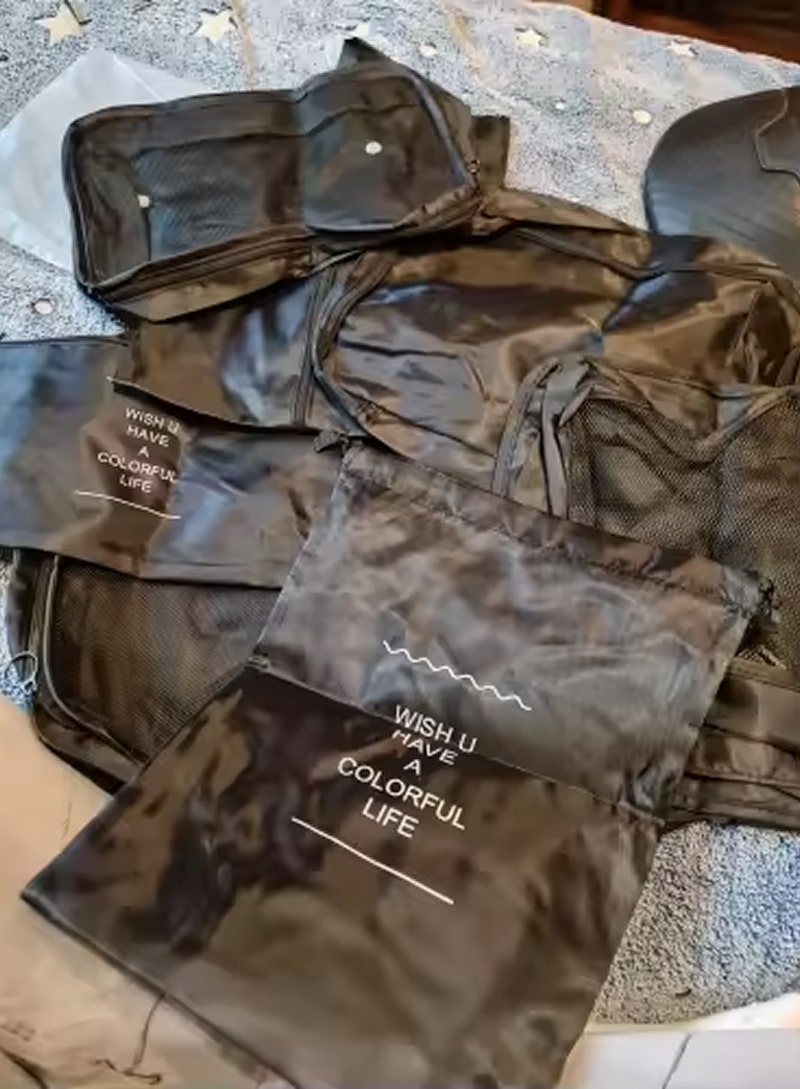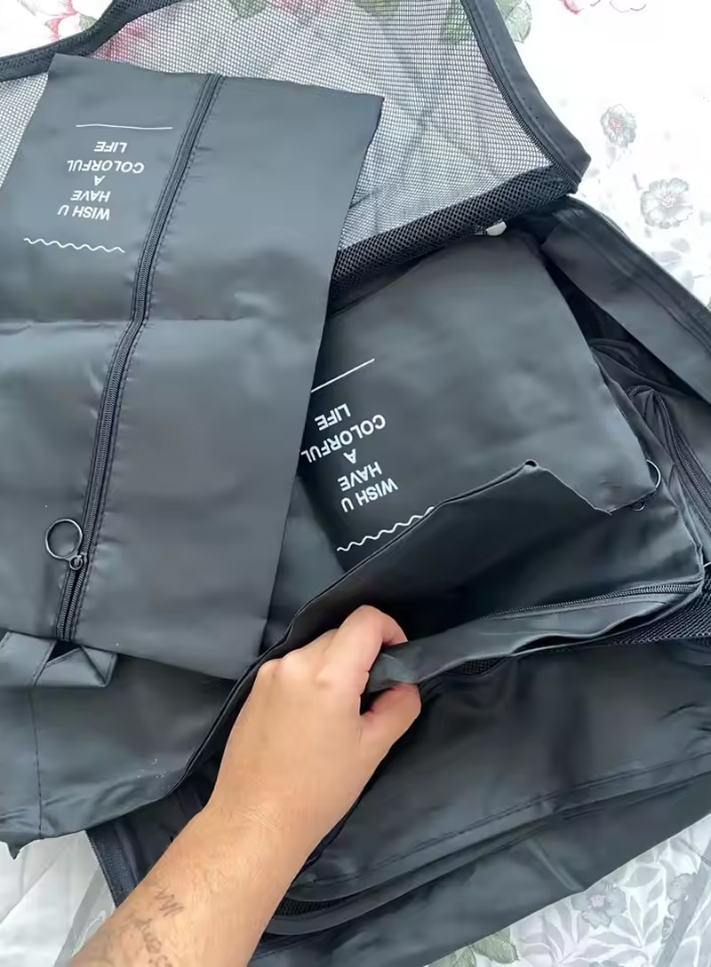 Seven specialized bags handle every packing need from underwear to shoes, creating a systematic approach that eliminates clutter and keeps similar items together for effortless unpacking.