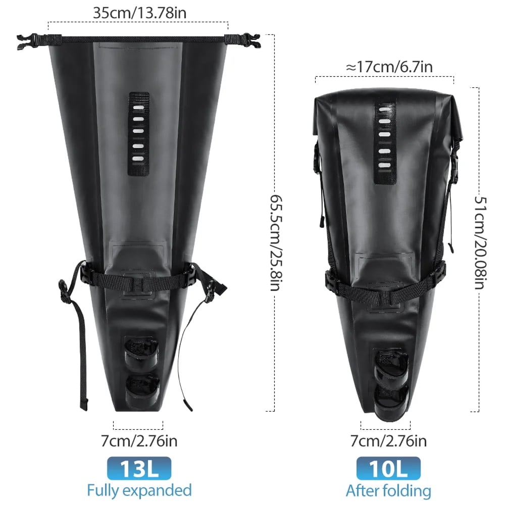 Adjust between 7L, 10L, and 13L configurations to match your trip requirements. The Cyclorav Bicycle Saddle Bag adapts from quick errands to weekend tours, eliminating the need for multiple bags.