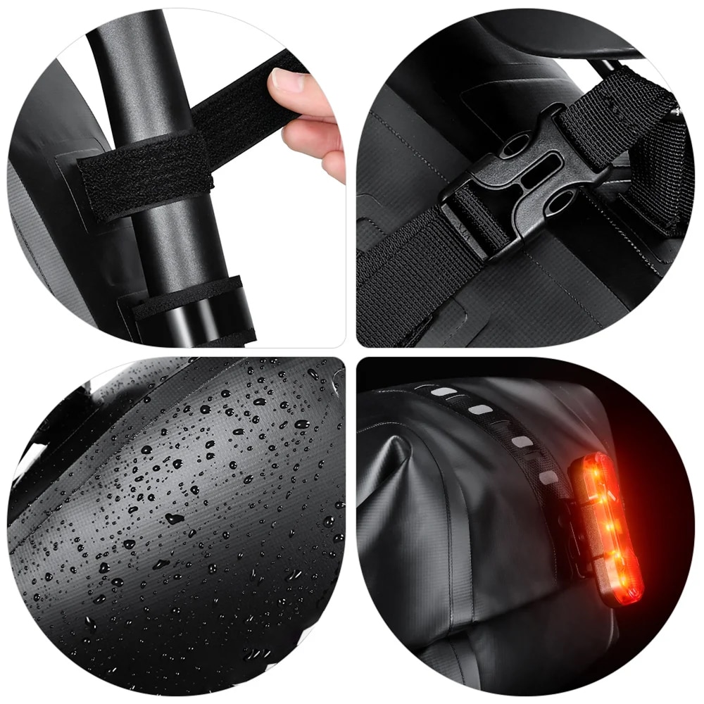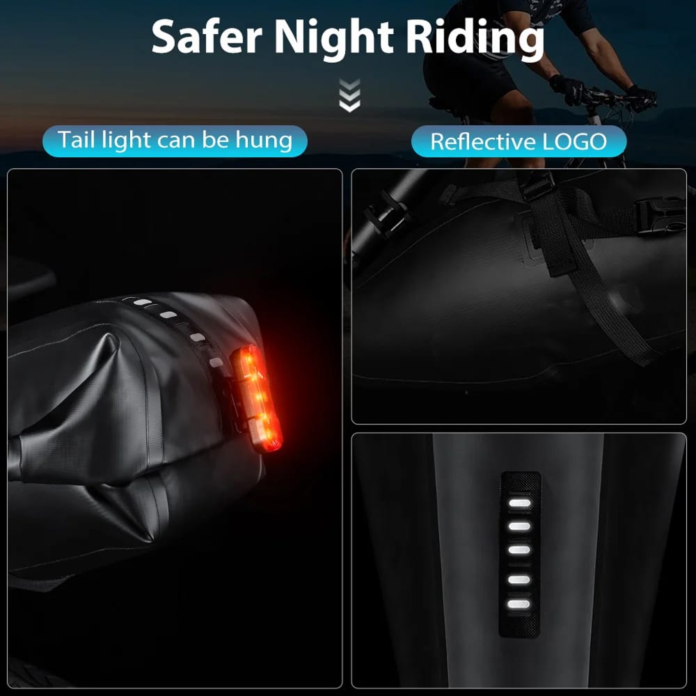 Reflective logo material and integrated tail light mount dramatically improve visibility during low-light conditions. The Cyclorav Bicycle Saddle Bag enhances safety for dawn, dusk, and night riding adventures.