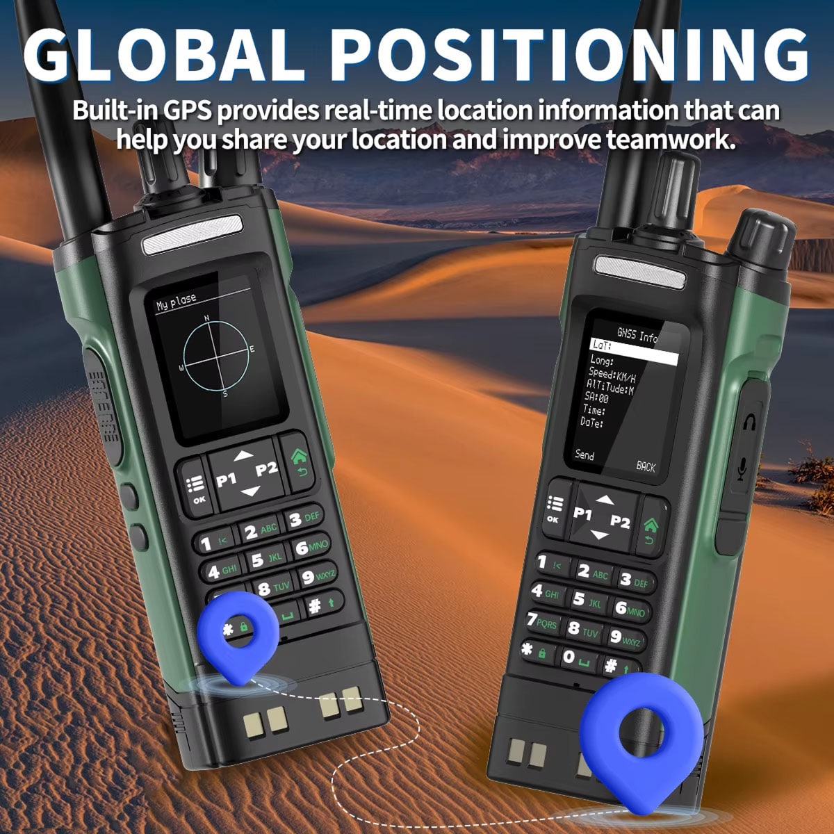 Yes, the built-in GPS operates independently of cellular networks, providing accurate positioning anywhere. APRS support enables location sharing through radio networks without internet connectivity.