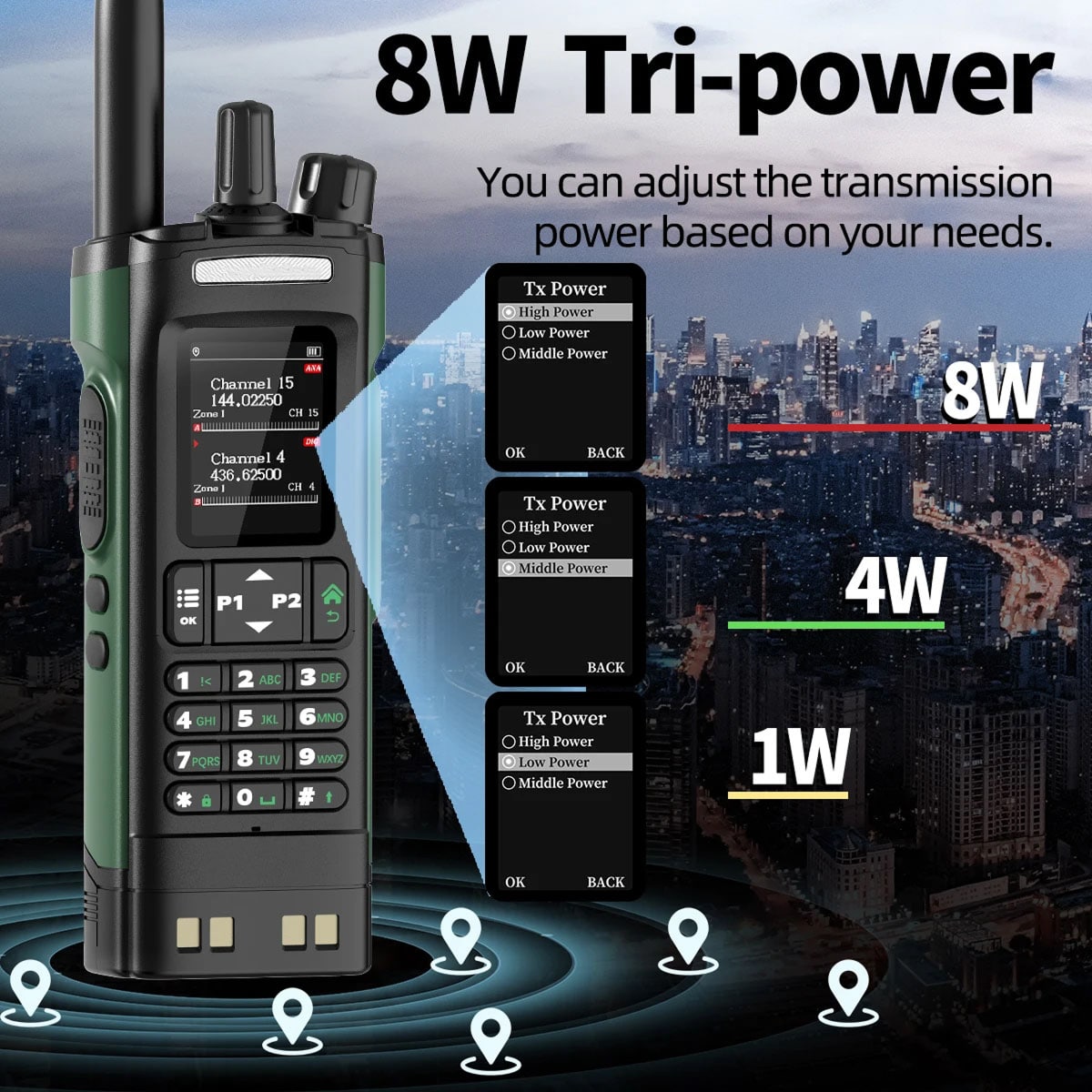 The DirioVexy provides reliable communication across 5-10km depending on terrain and conditions. Urban environments may reduce range, while open areas maximize distance with adjustable 5-10W output power.