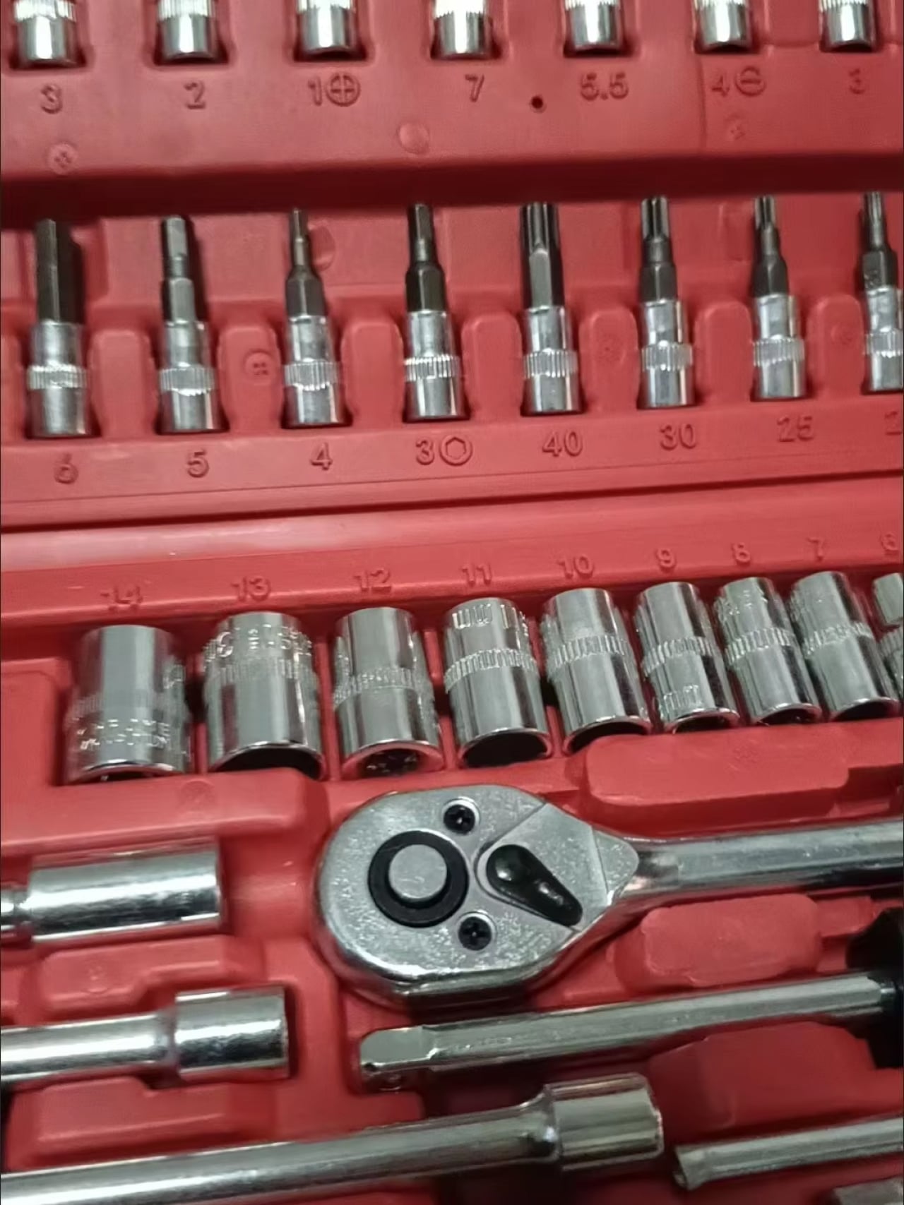 I’m impressed by the quality of each piece. The ratchet action is smooth, and the sockets fit perfectly on various fasteners.