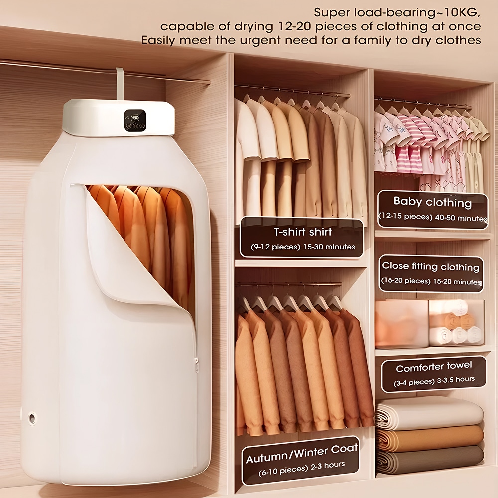 The DryVyex dries most loads in 20-30 minutes using its powerful 600W PTC ceramic heating system. Heavier items may require 45-60 minutes depending on fabric thickness and moisture levels.