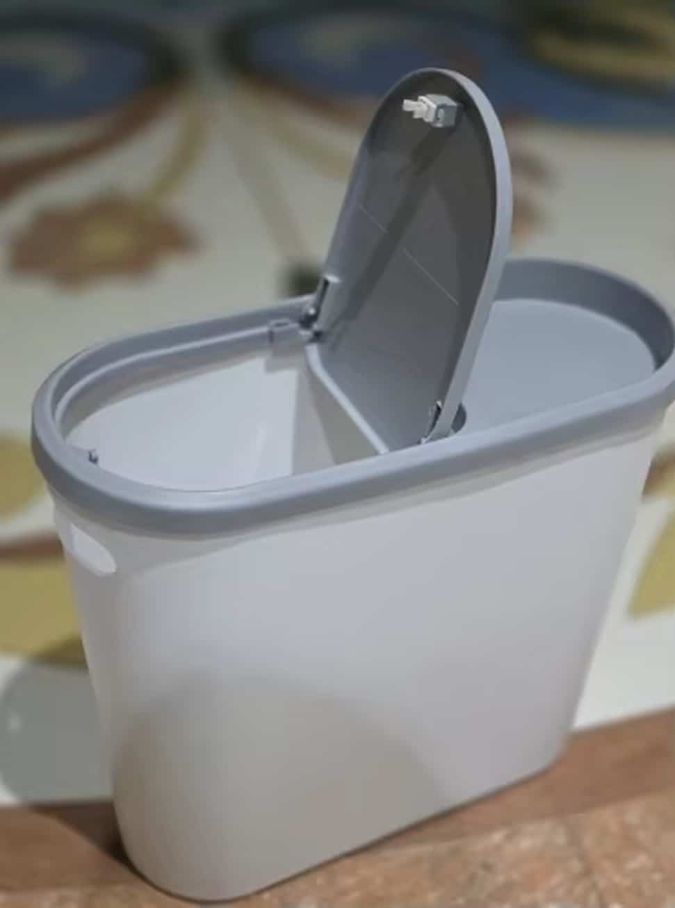 Wipe the exterior with a damp cloth and mild soap. The smooth plastic surfaces resist stains and clean easily. The inner bucket removes for thorough washing. The press mechanism requires no special maintenance and continues functioning smoothly with regular use.