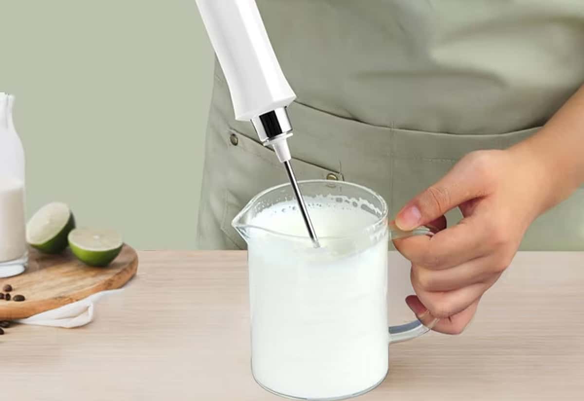 The FoamFlicki comes with three attachments: a baking mixing head (whisk), a milk froth mixing head (spiral coil), and a milk powder mixing head (curved hook) for versatile use.