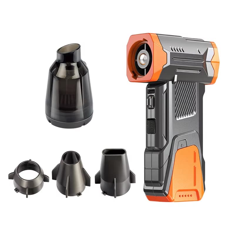 The vacuum mode activates with included attachments that create suction for debris collection. The package includes specialized nozzles for tight spaces, broad surfaces, and the removable filter captures particles efficiently.