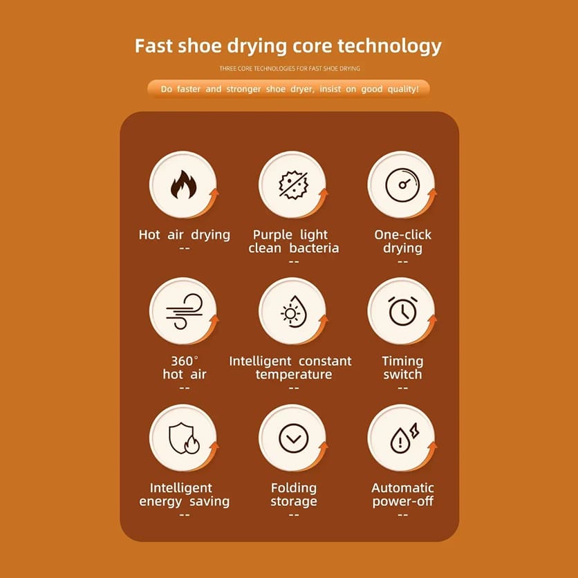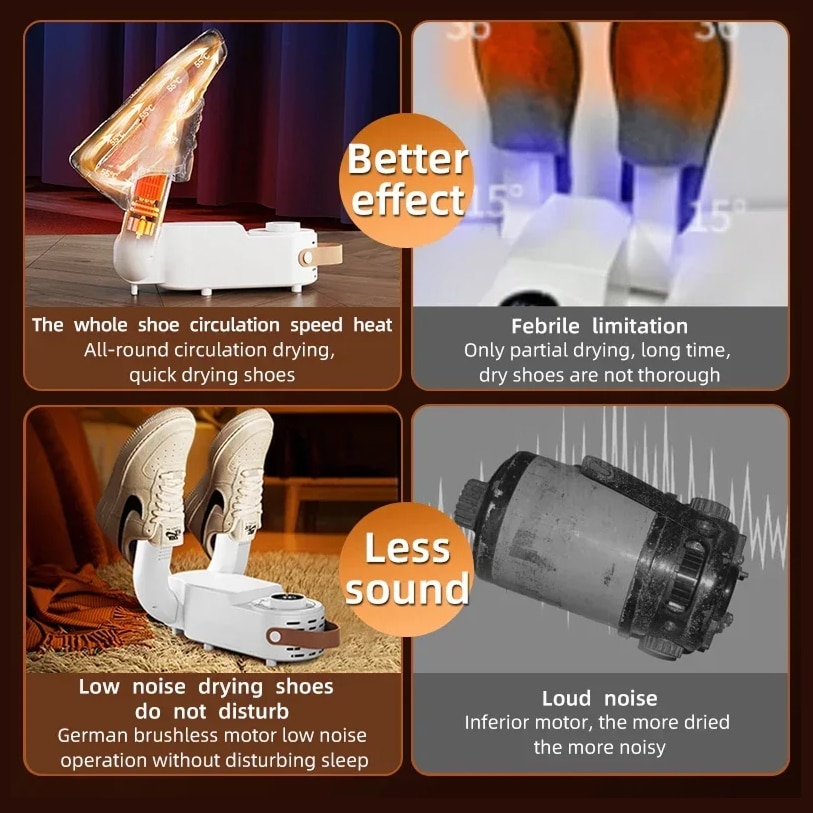 Absolutely not. The intelligent thermostatic system maintains a safe 48°C constant temperature that dries effectively without damaging leather, suede, canvas, or synthetic materials.