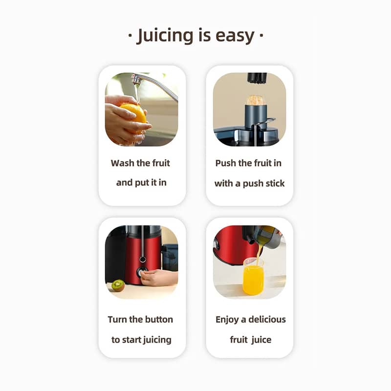 Juicing is fast: a serving takes 30–60 seconds. The 65mm chute accepts whole fruits, and the 800W motor works quickly. With brief cleanup, juice is ready in under three minutes.