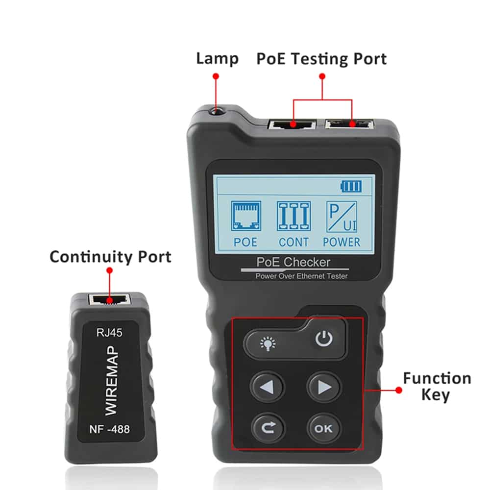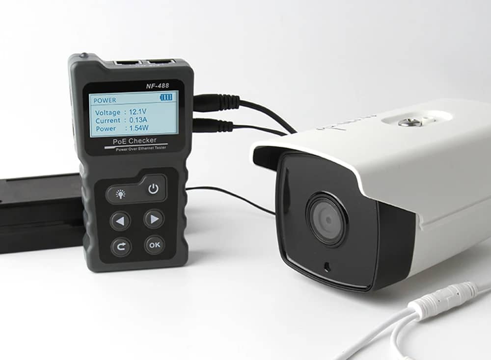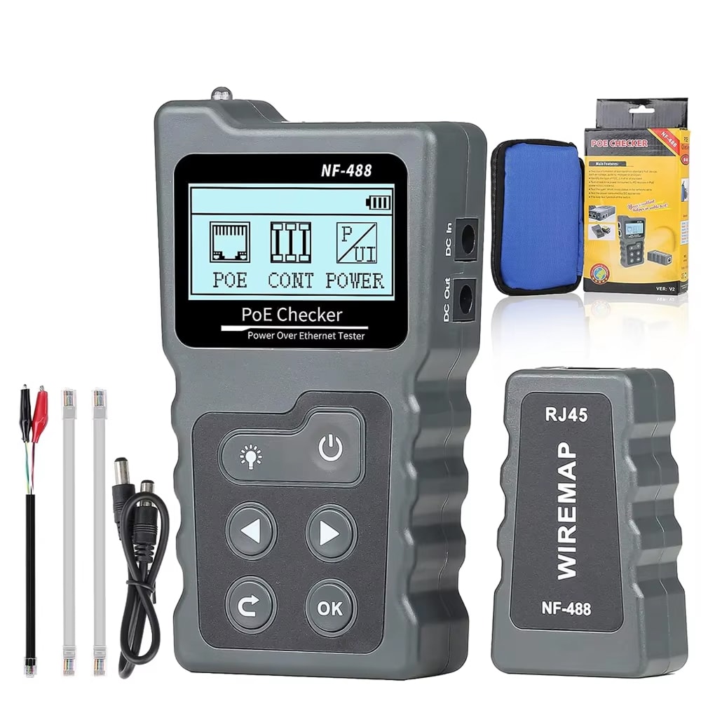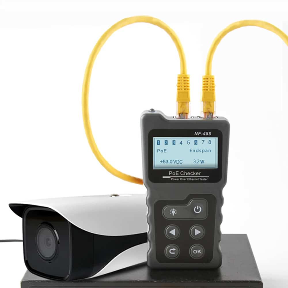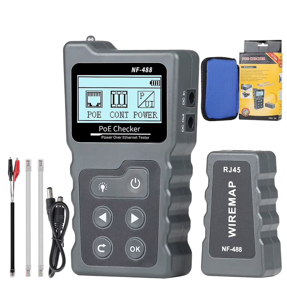 The Netiolax Network Cable Tracker tests both 802.3af and 802.3at PoE standards. It verifies power supply voltage, polarity, and actual power consumption to ensure your PoE devices receive proper power delivery.