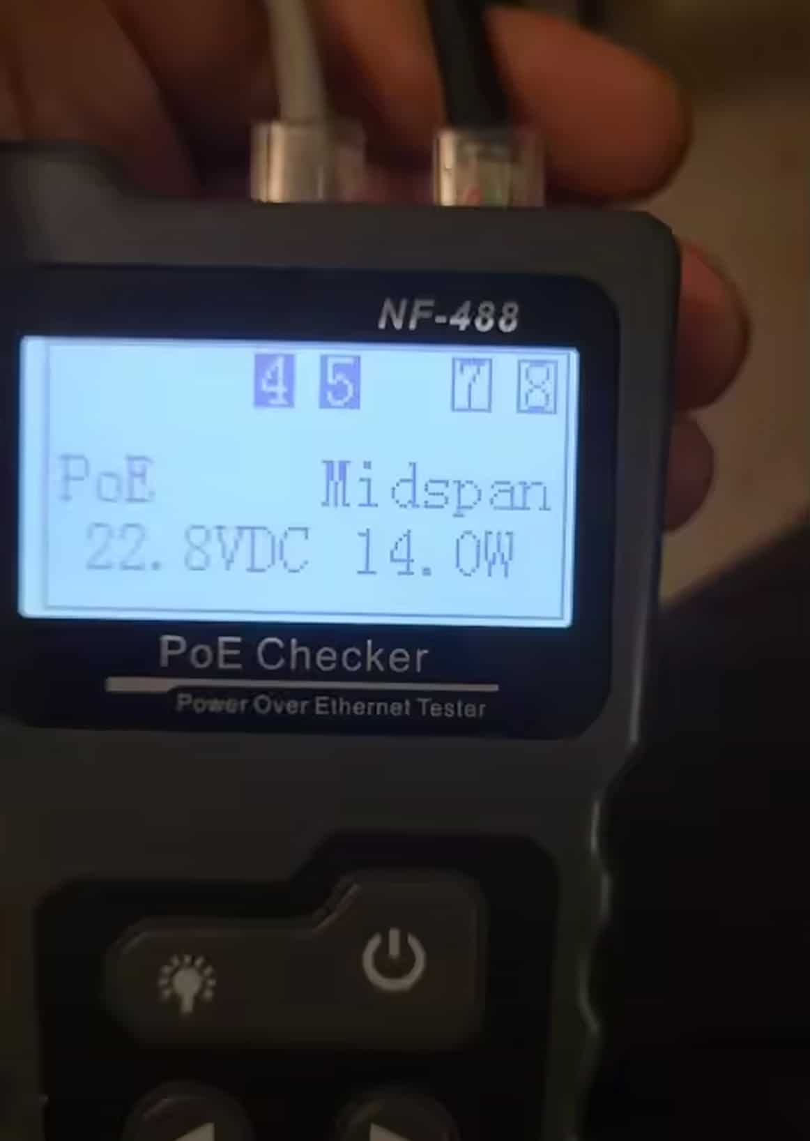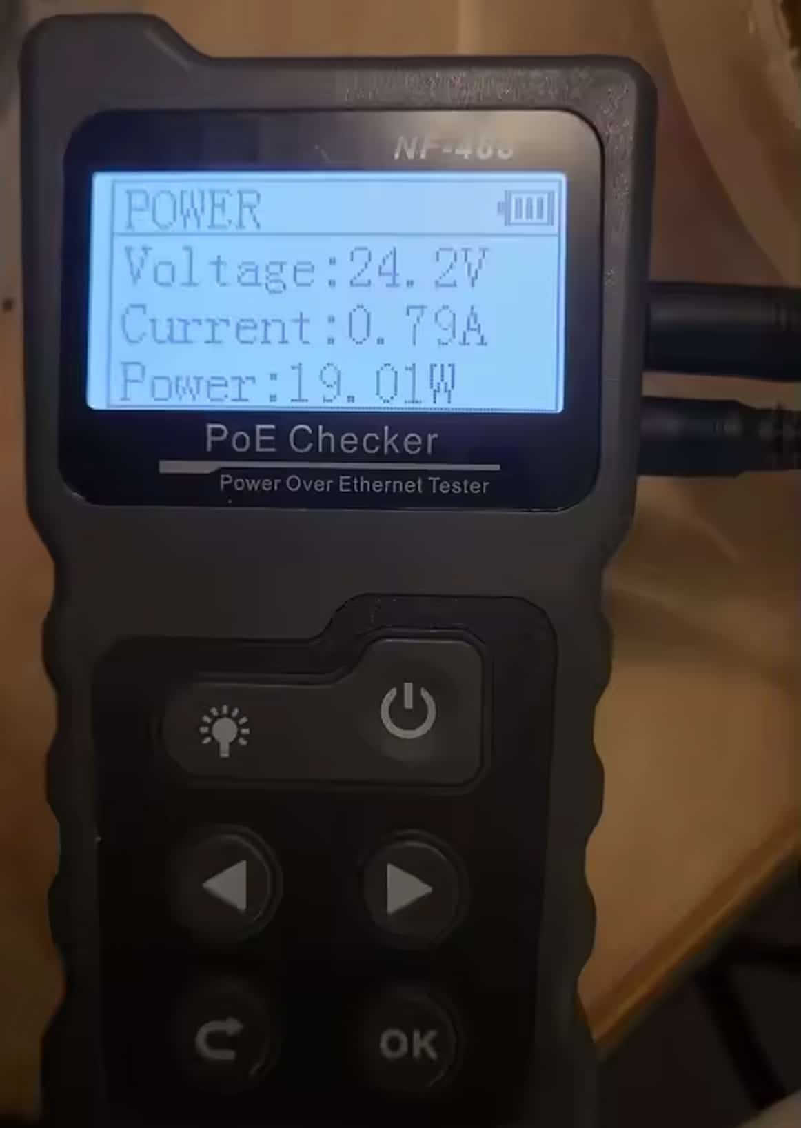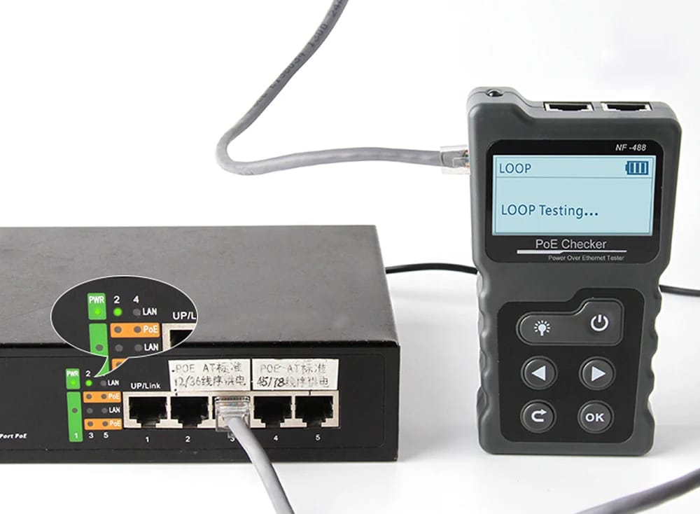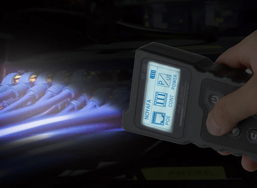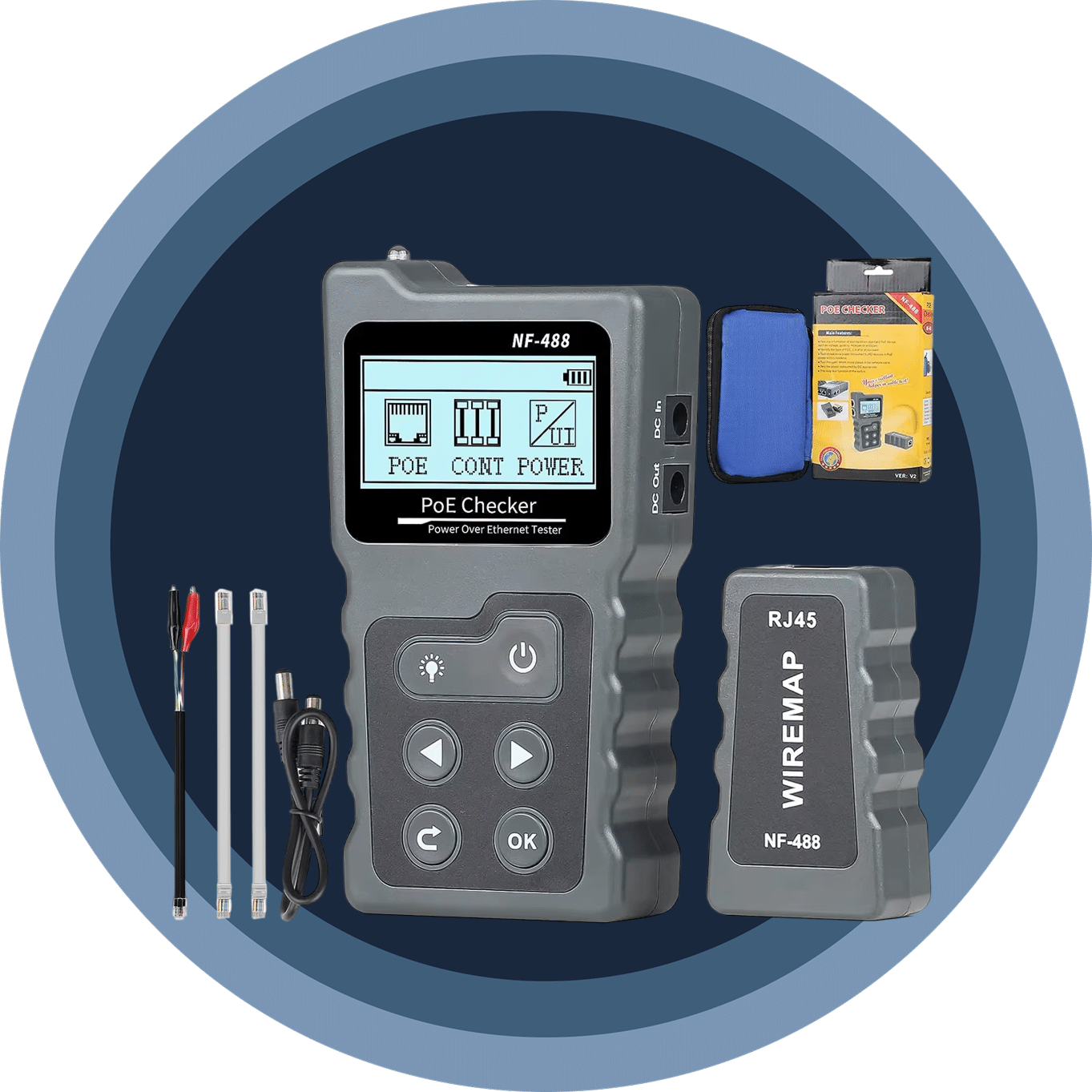 The Netiolax Network Cable Tracker tests both 802.3af and 802.3at PoE standards. It verifies power supply voltage, polarity, and actual power consumption to ensure your PoE devices receive proper power delivery.