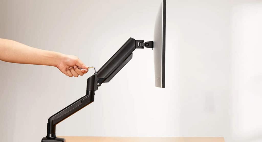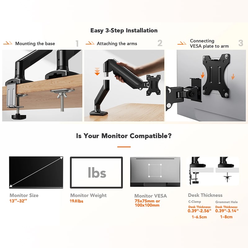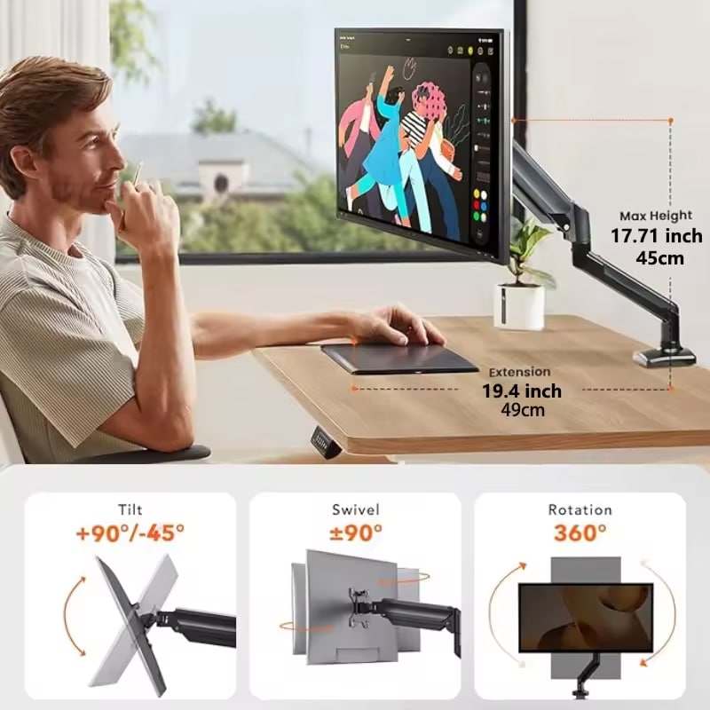 The gas spring mechanism provides smooth, effortless height adjustment without requiring manual force or tools. Simply lift or lower your monitor to the desired position, and the gas spring will hold it securely in place, allowing for quick repositioning throughout your workday.