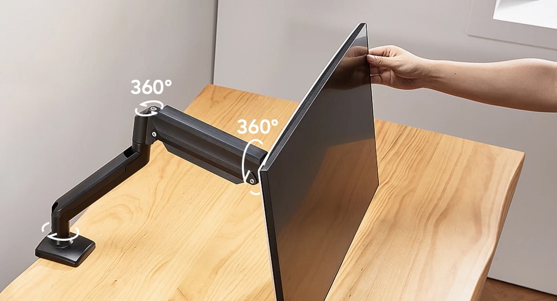 Yes, the arm features complete 360-degree rotation capability, allowing you to easily switch between landscape and portrait orientations. This flexibility is ideal for tasks like coding, document editing, or any work that benefits from vertical screen orientation without requiring monitor remounting.