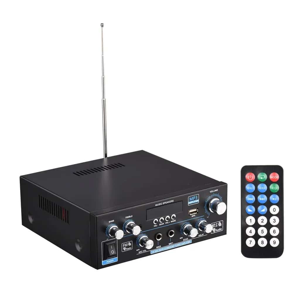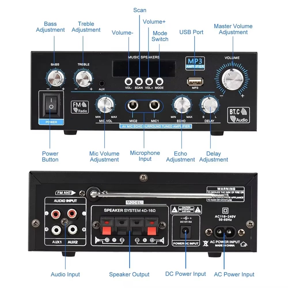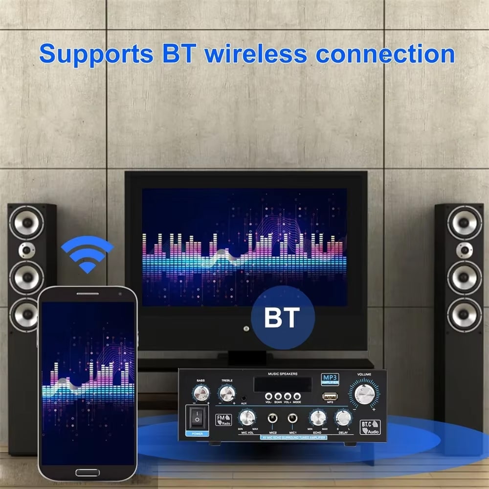 Yes! The amplifier features dual microphone inputs with dedicated volume, echo, and delay controls, making it ideal for karaoke parties, presentations, or public speaking events.