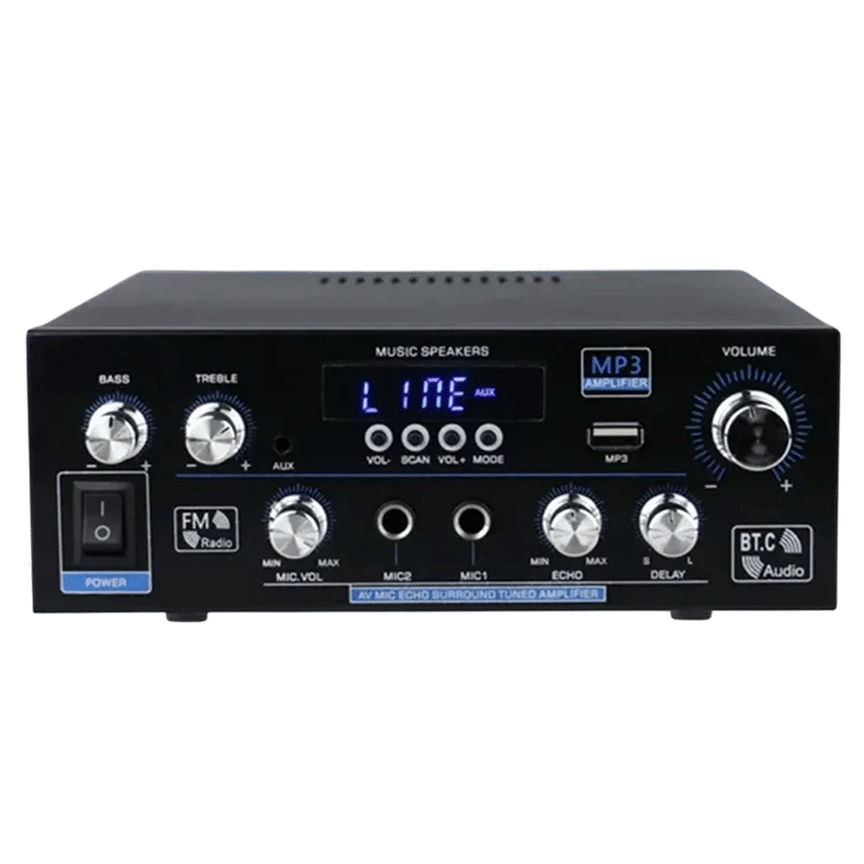 Use the MODE button on the front panel or remote control to cycle through Bluetooth, USB, FM, and AUX inputs. The LED display shows your current source selection clearly.