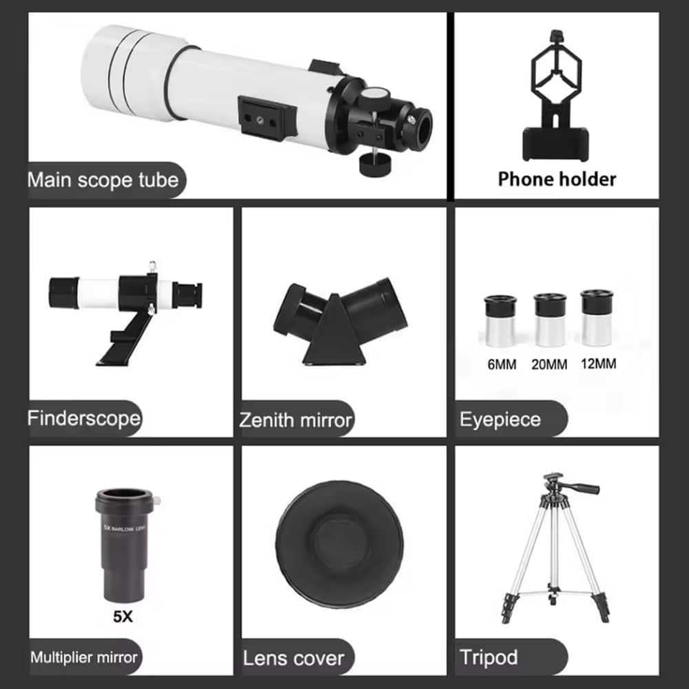 Everything you need arrives in one comprehensive package: three eyepieces, 5X Barlow lens, phone clip, moonlight filter, and zenith mirror. Begin your astronomical adventures immediately without purchasing additional accessories.