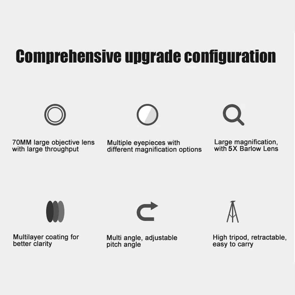 For the price, this telescope offers remarkable quality. The 70MM lens gathers ample light, and the multiple eyepieces provide excellent versatility. I’ve successfully observed Jupiter’s bands and Saturn’s rings. Outstanding investment for amateur astronomers.