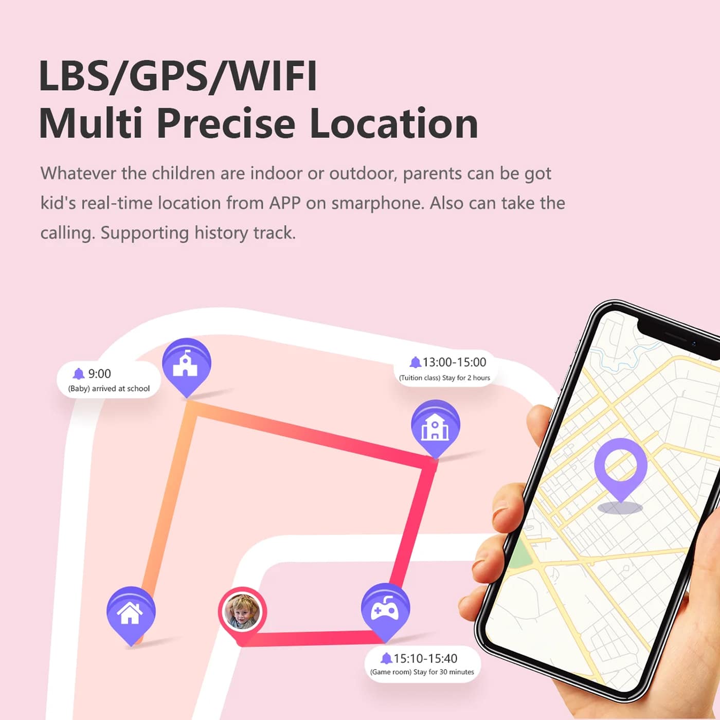Through the parent app, easily create custom safe zones around home, school, or other frequent locations. You'll receive instant notifications when your child enters or leaves these designated areas, providing proactive safety monitoring effortlessly.