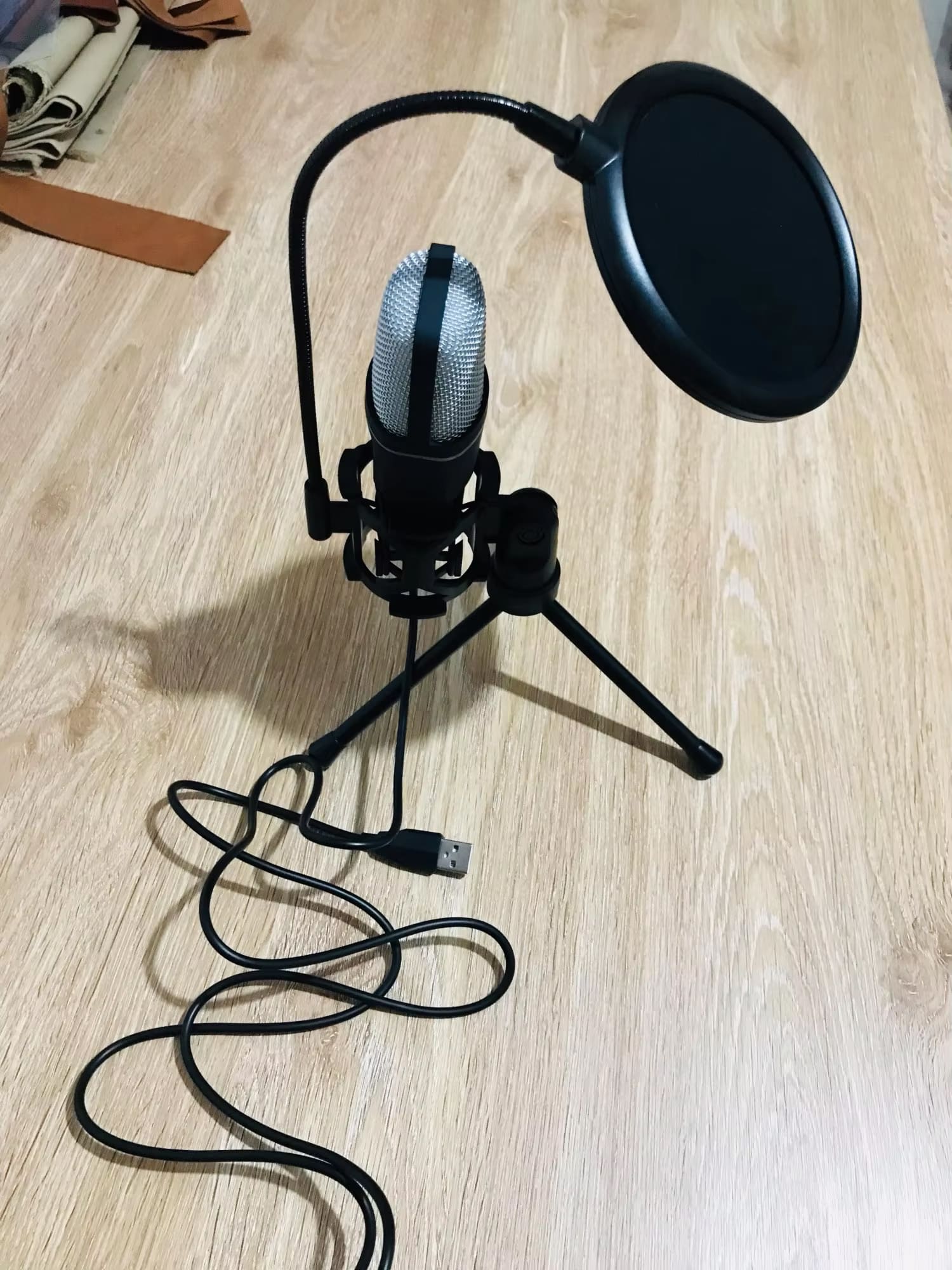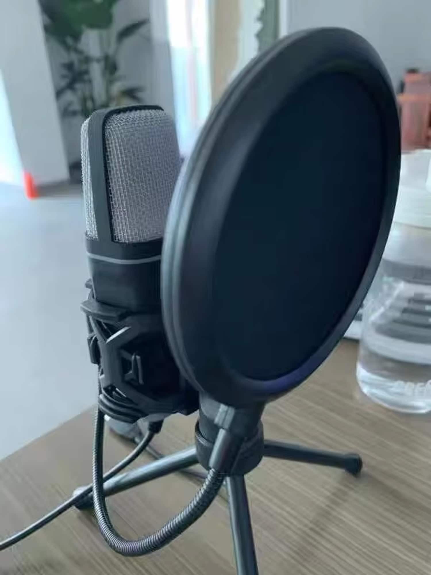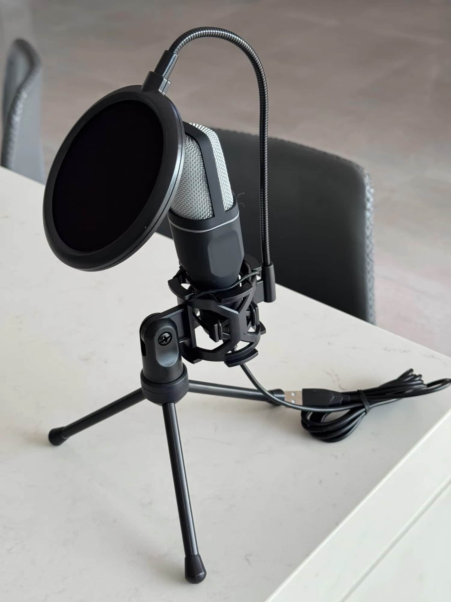 The included foldable tripod provides stable positioning at standard desktop height. The flexible hose design allows extensive angle adjustments to position the microphone optimally for your recording needs and preferences.